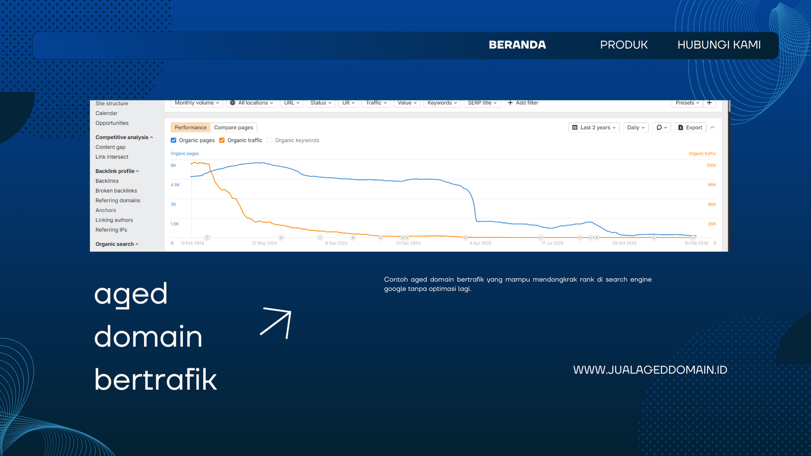 Jual Aged Domain Bertrafik dan berkualitas dengan harga murah. Aged domain, atau domain yang sudah ada selama beberapa tahun, memiliki potensi besar dalam meningkatkan SEO dan traffic situs web. Hal ini karena domain yang sudah lama beroperasi sering kali memiliki sejarah backlink yang kuat dan otoritas mesin pencari yang tinggi. Dengan membeli domain yang telah mapan, Anda bisa menghemat waktu dan usaha dalam membangun otoritas situs dari awal. Aged domain bertrafik biasa akan lebih mudah untuk dioptimasi atau lebih cepat peluangnya untuk menempati halaman pertama di google ketika di optimasi.